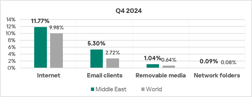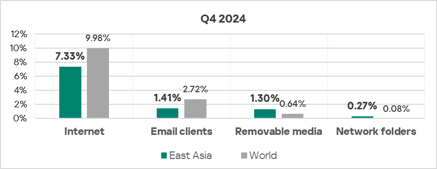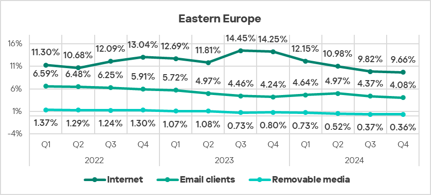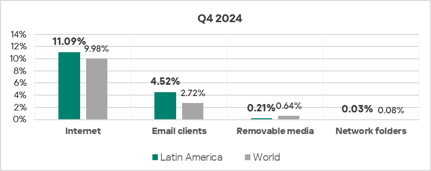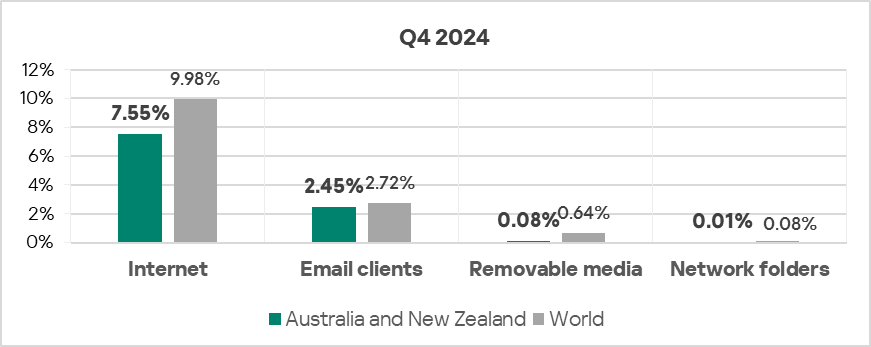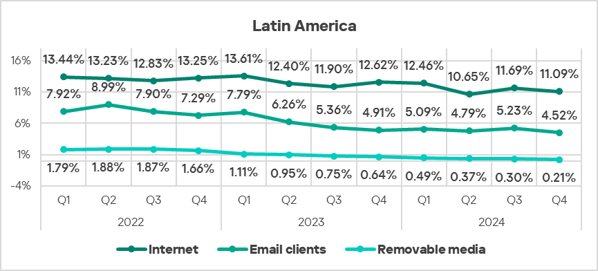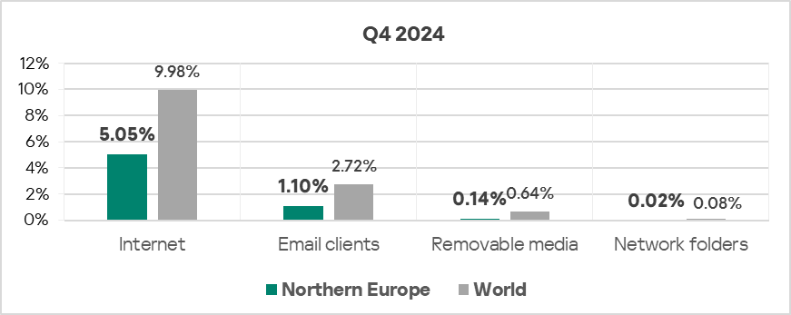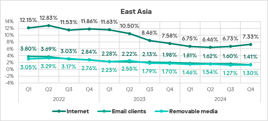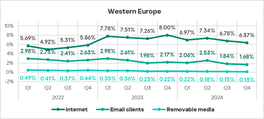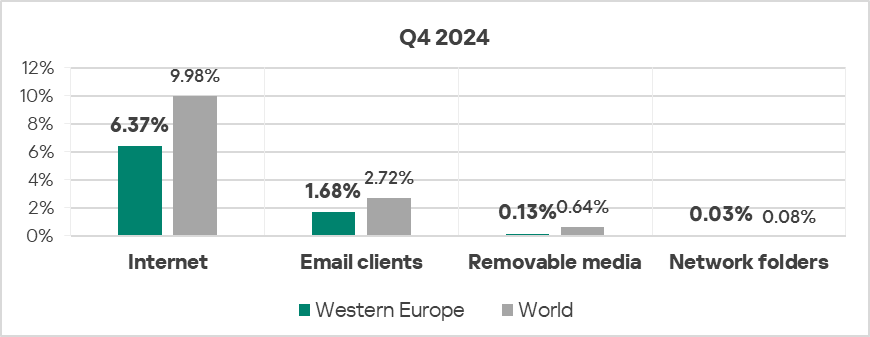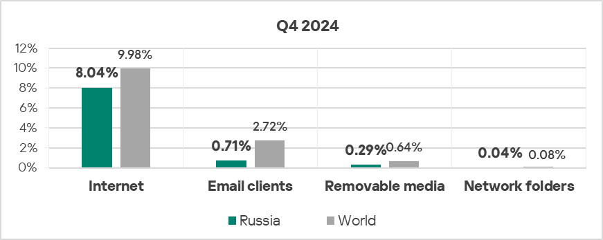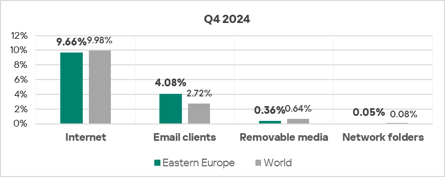 - Threats from the internet, email clients, and network folders exhibited a decrease in Q4 2024.