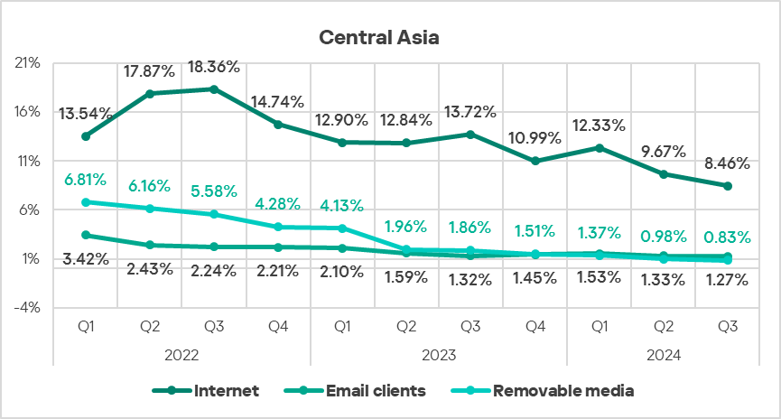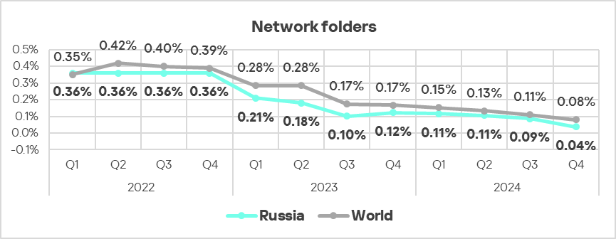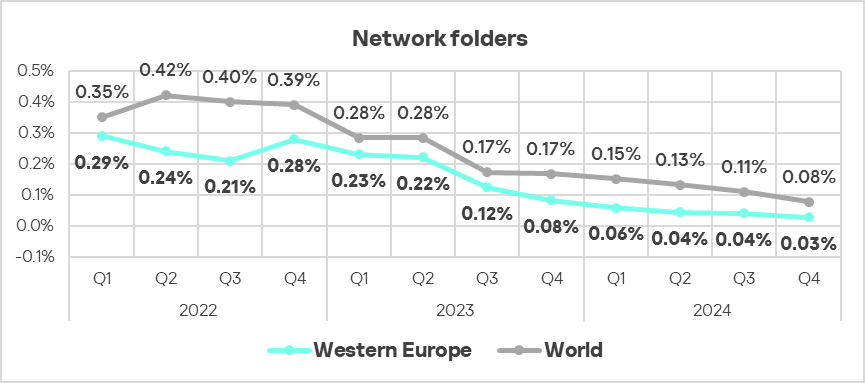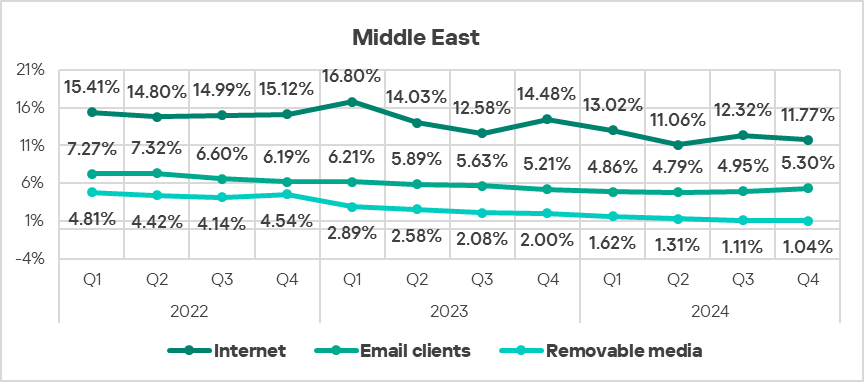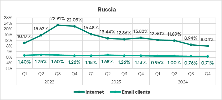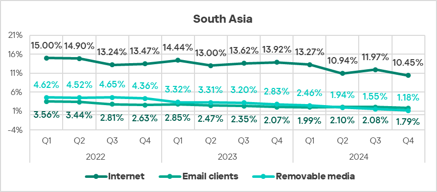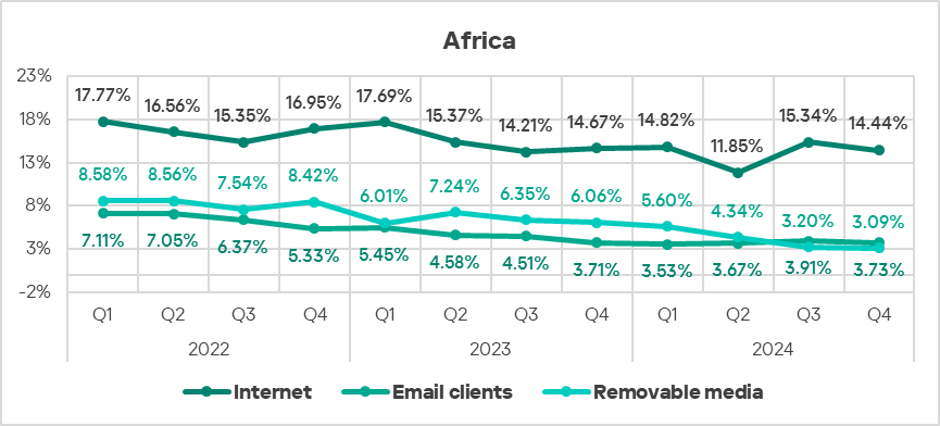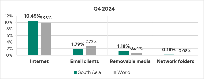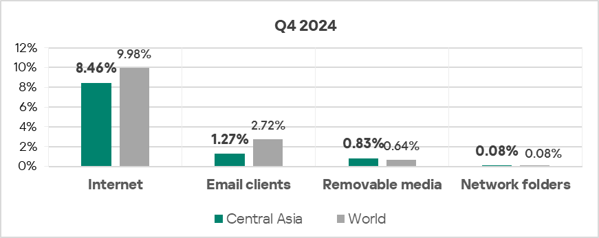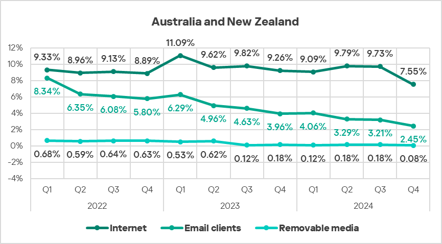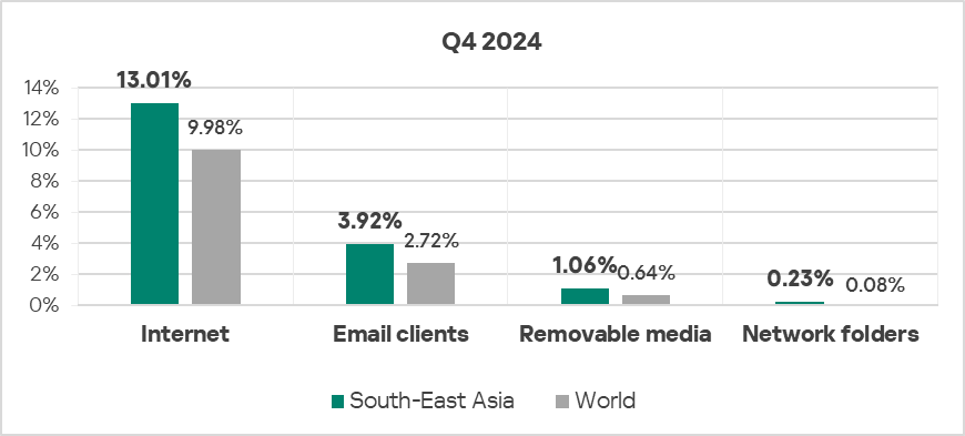 - Threats from the internet, email clients, and network folders exhibited a decrease in Q4 2024.