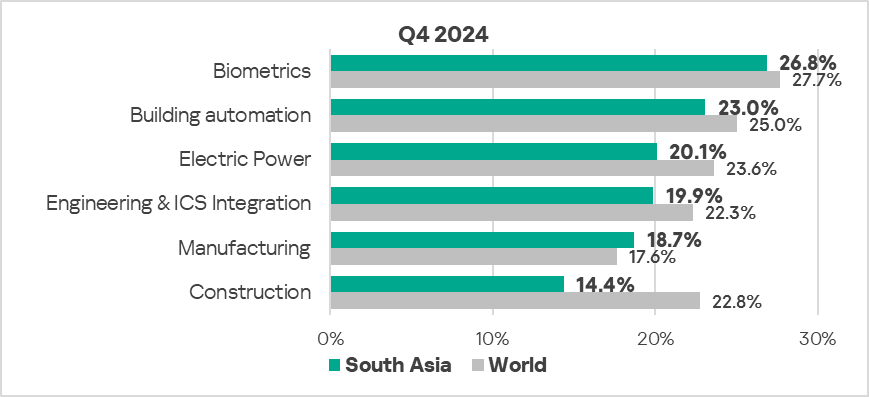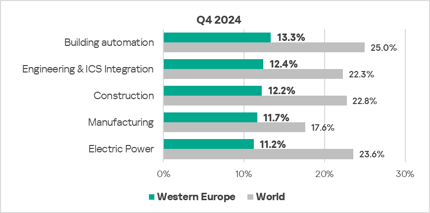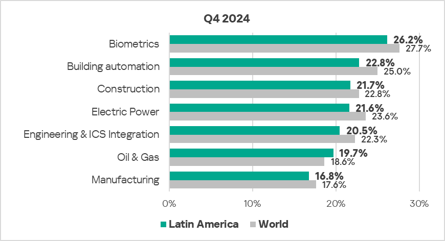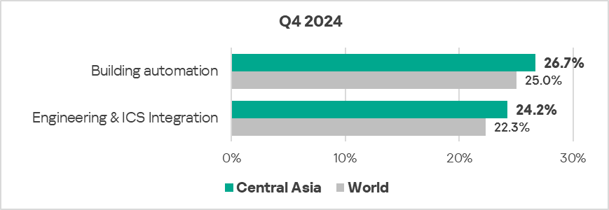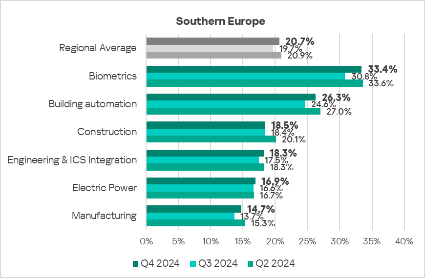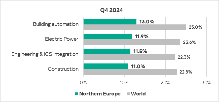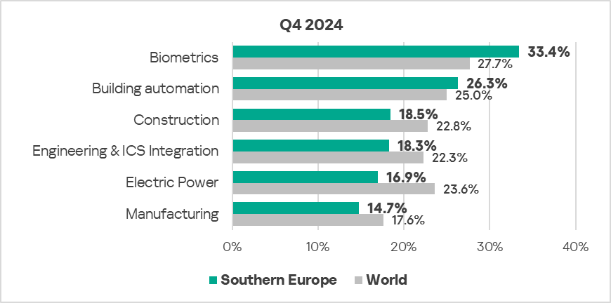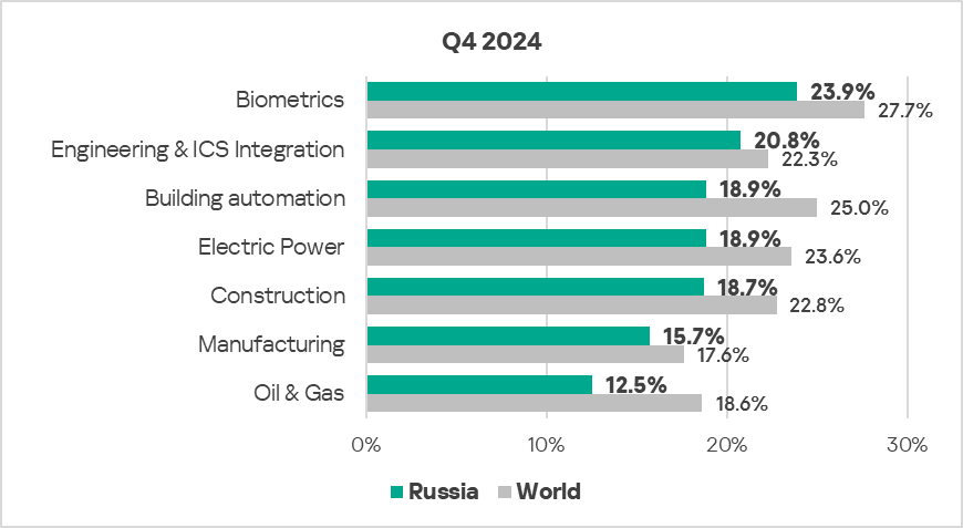- Compared to the respective global averages, the biometrics and building automation sectors saw a higher percentage of ICS computers on which malicious objects were blocked in Q4 2024 – by 1.2 and 1.1 times respectively.