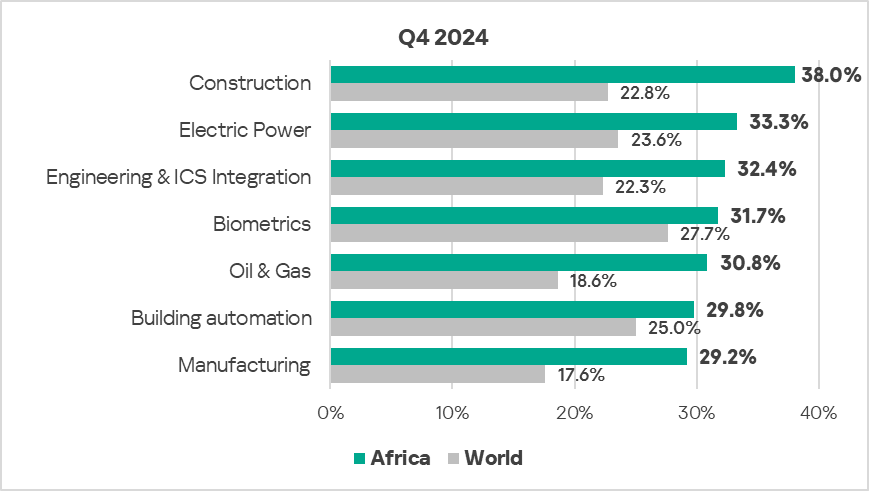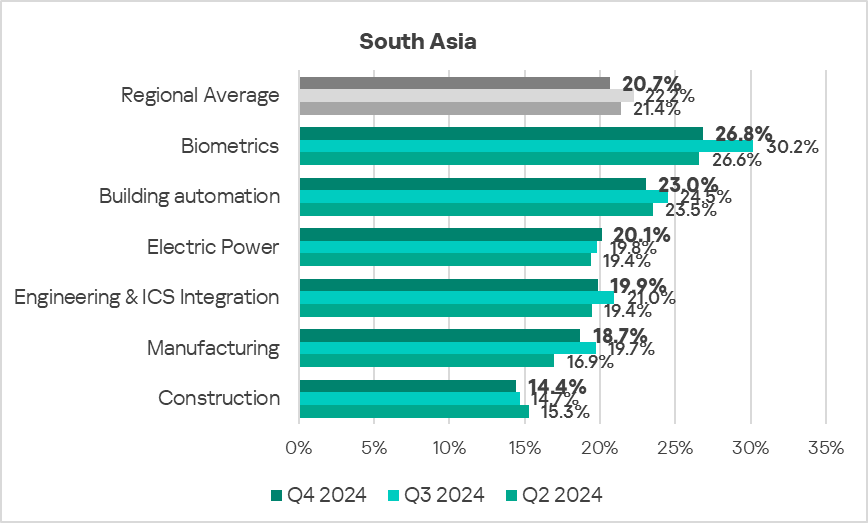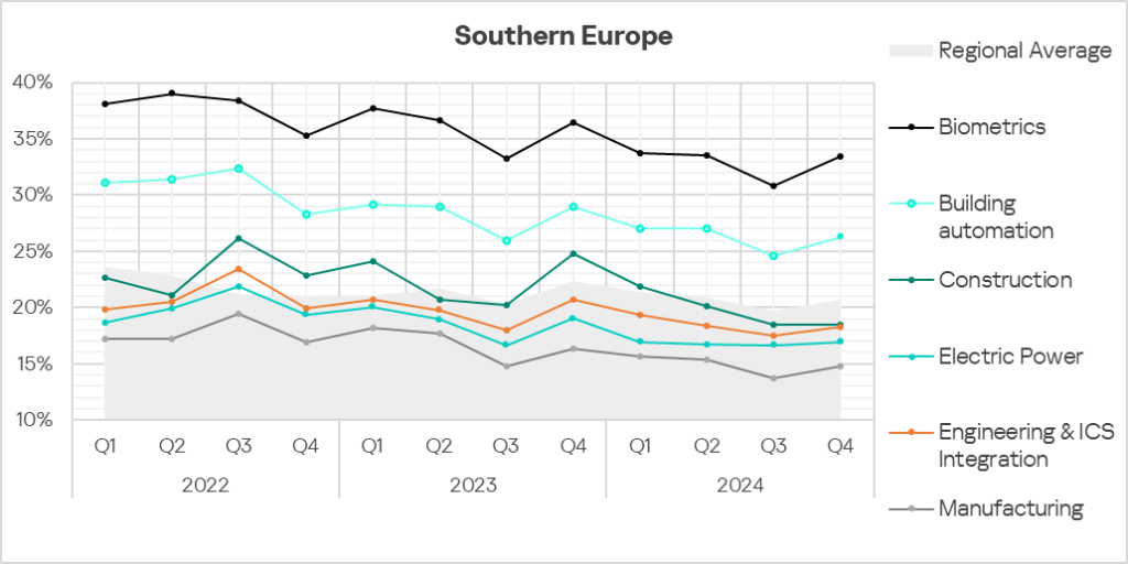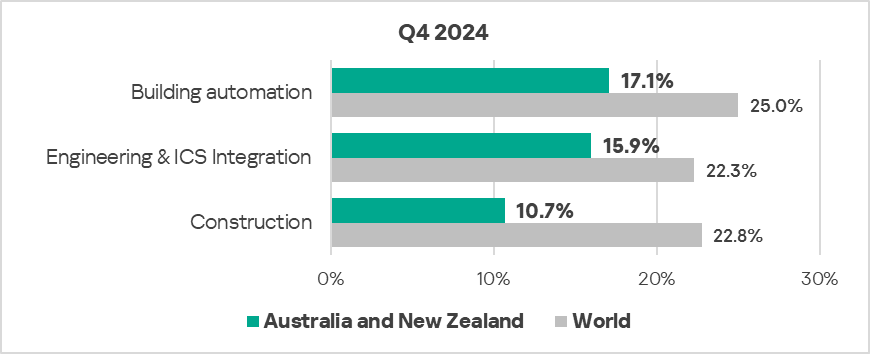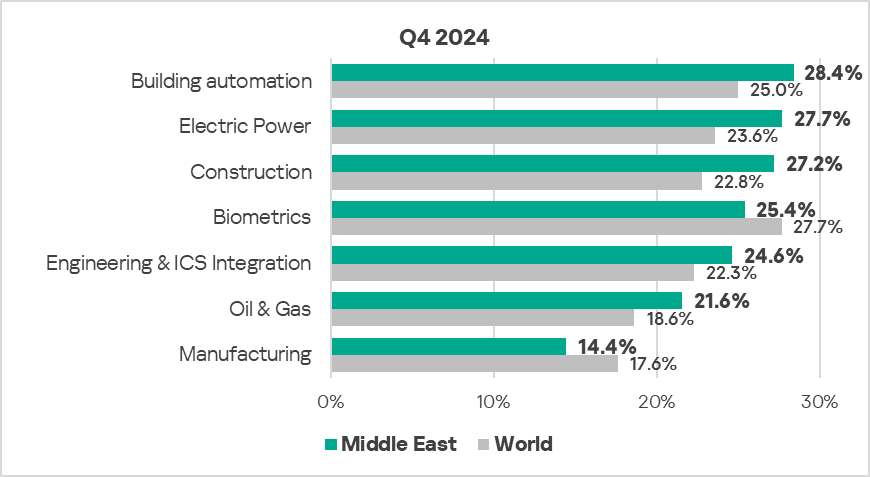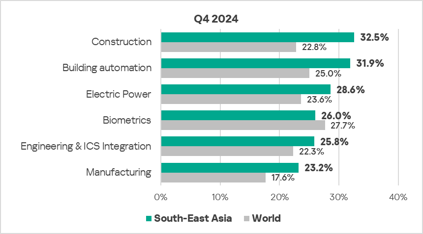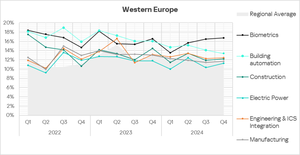 - Compared to the respective global averages, the biometrics and building automation sectors saw a higher percentage of ICS computers on which malicious objects were blocked in Q4 2024 – by 1.2 and 1.1 times respectively.