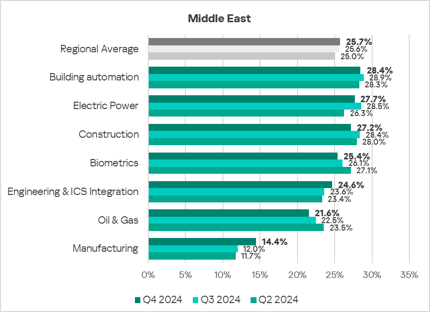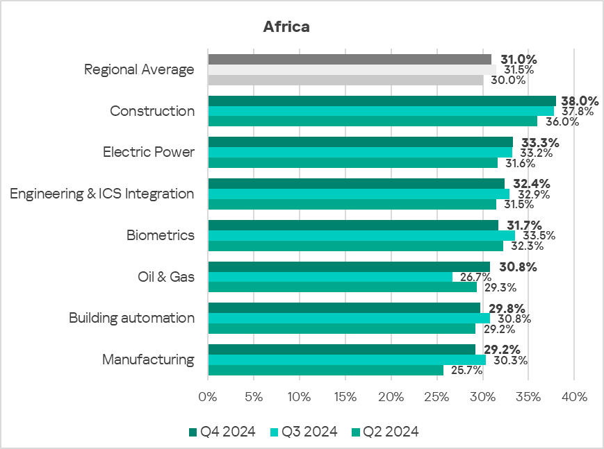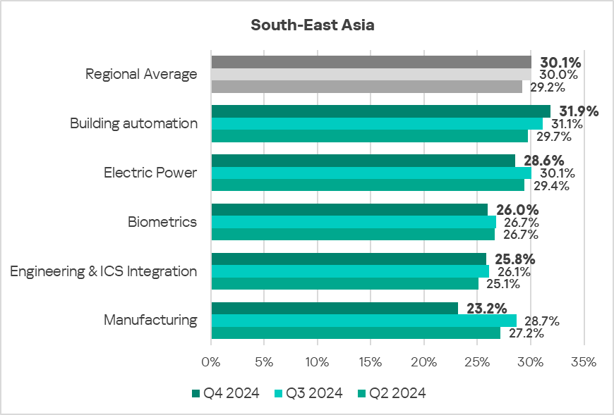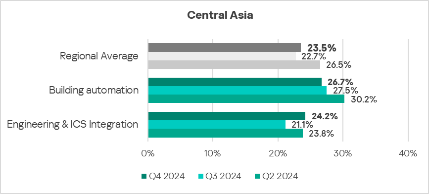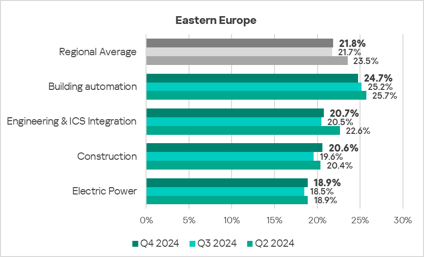 - In Q4 2024, all sectors under observation in the region exhibited an increase in the percentage of ICS computers on which malicious objects were blocked: