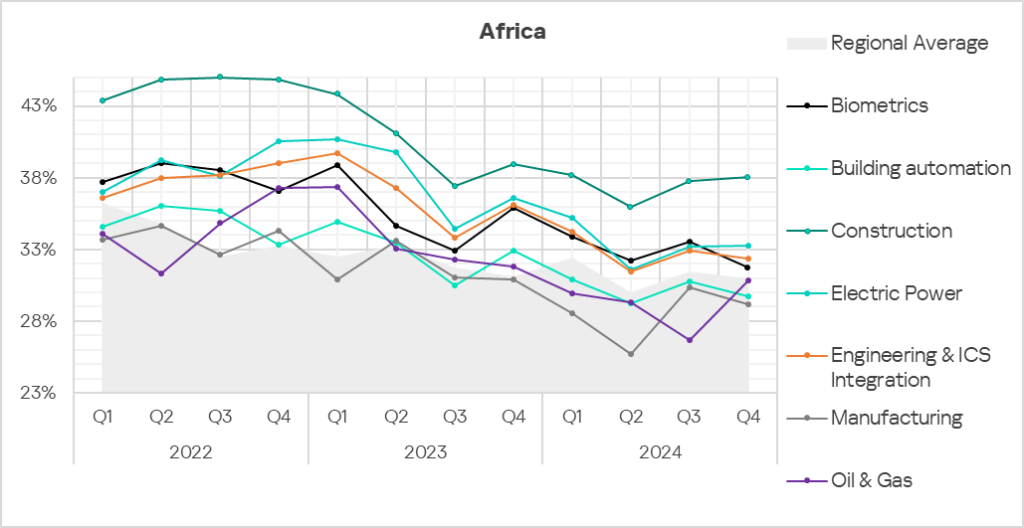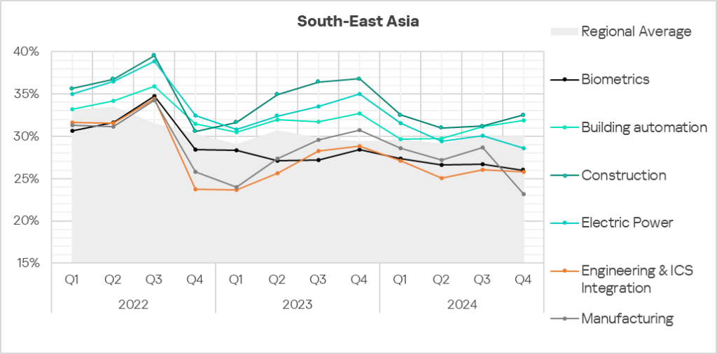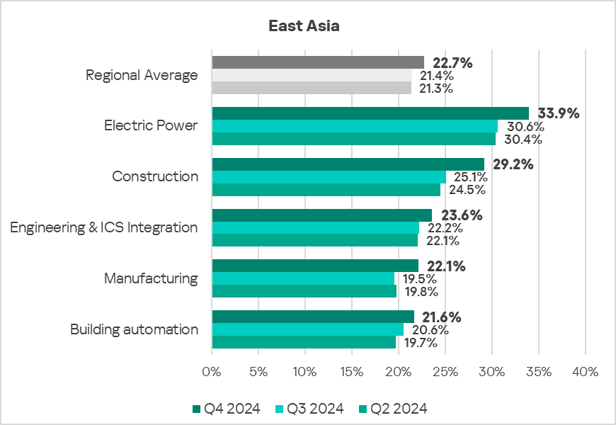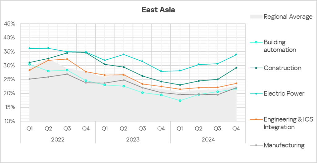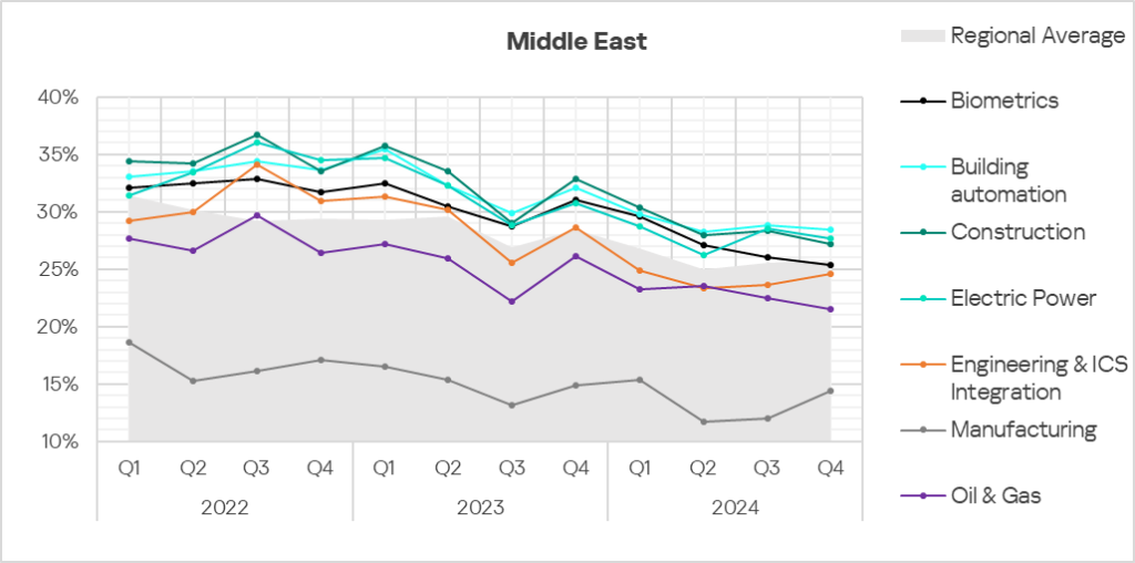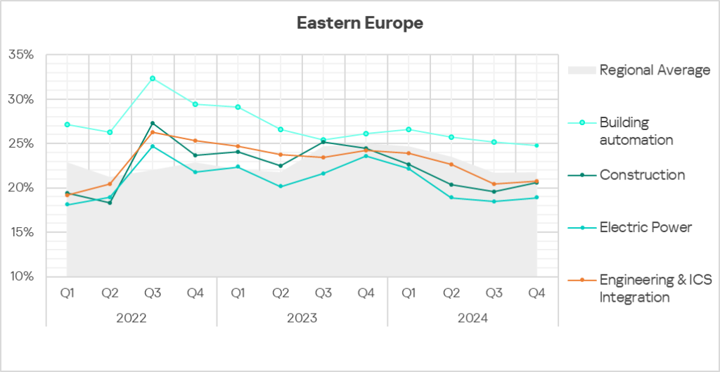 - In Q4 2024, the region saw a substantial decrease in threats that were blocked on ICS computers – around 1.2 times.