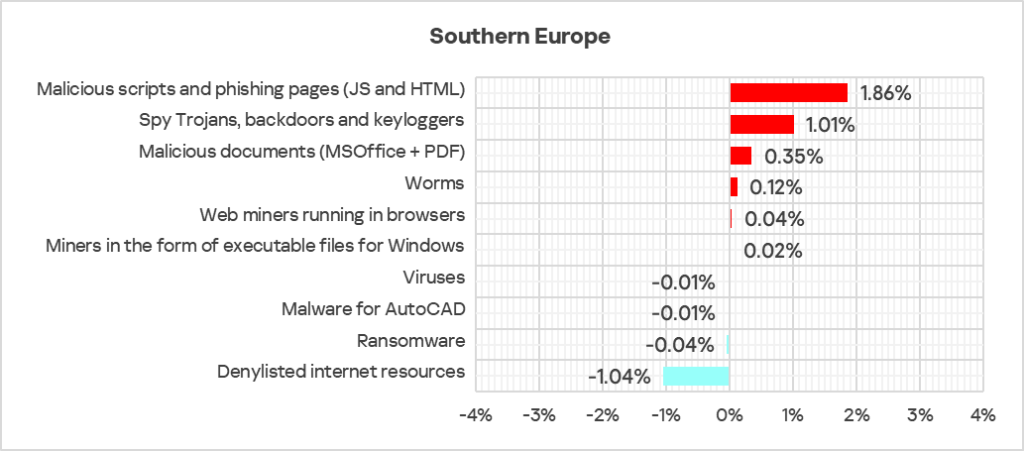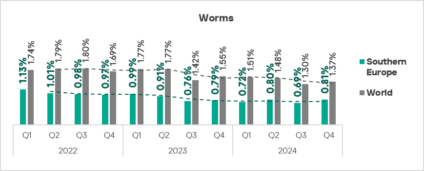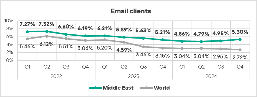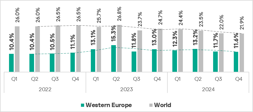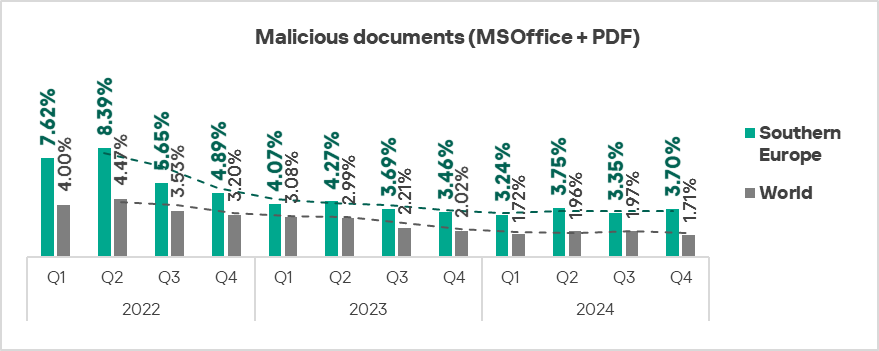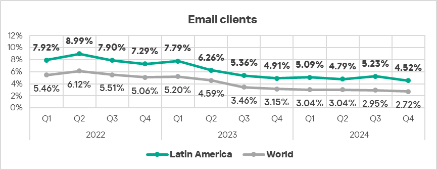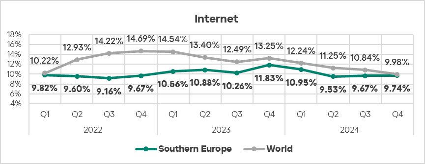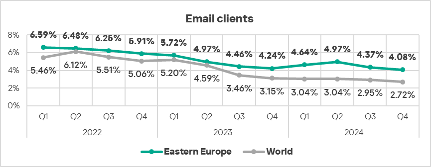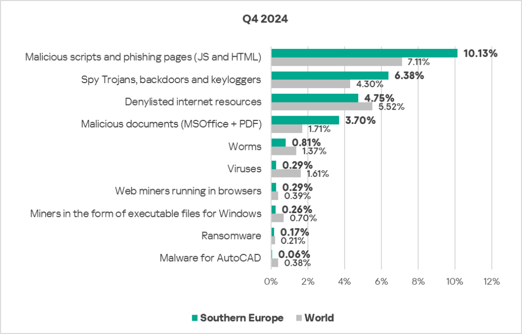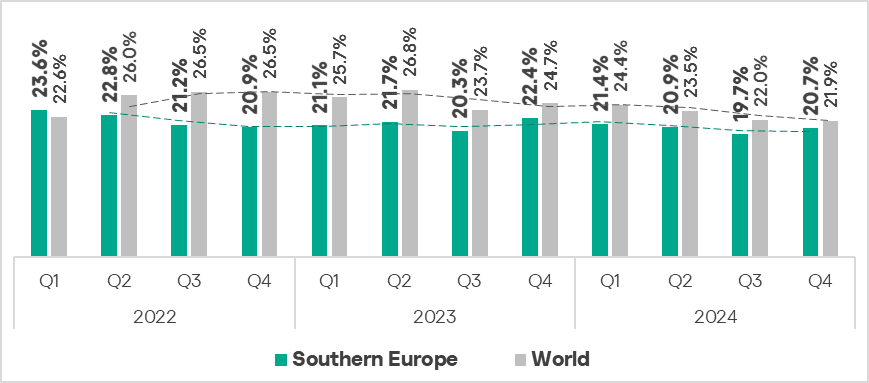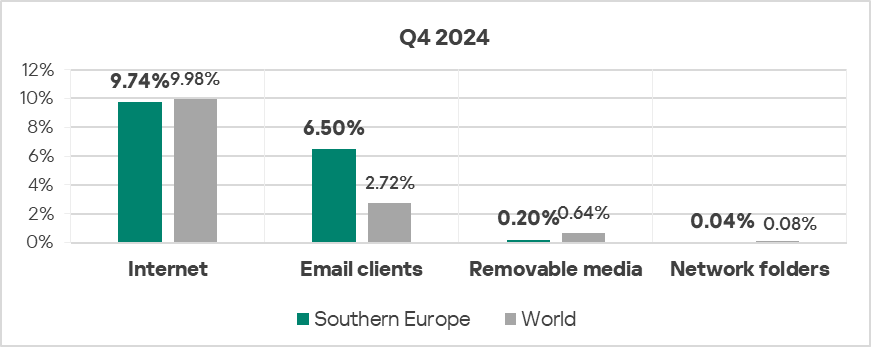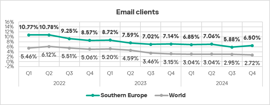 - In Q4 2024, Southern Europe again ranked first globally in the percentage of ICS computers where malicious threats from email clients were blocked, exceeding the global average by 2.4 times. The region showed an increase from Q3 2024.