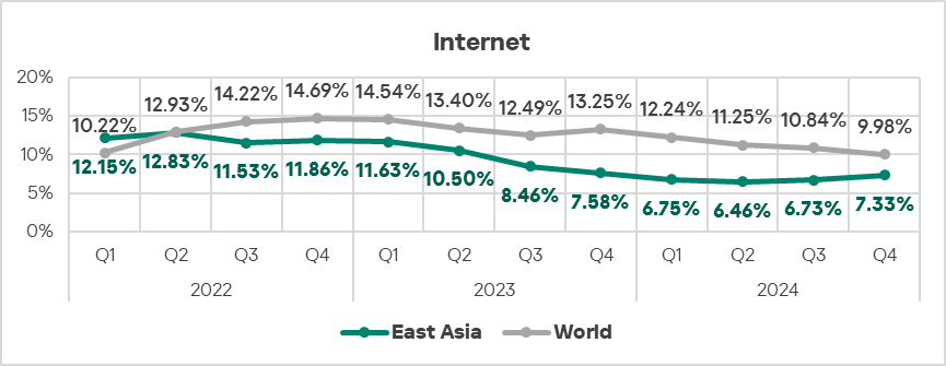 - In Q4 2024, the percentage of ICS computers on which threats from the internet were blocked increased compared to the previous quarter, in contrast to the global trend.