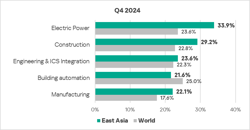 - In Q4 2024, all sectors, except building automation, exhibited an increase in the percentage of ICS computers on which malicious objects were blocked. The most notable increase was in the electric power sector – by 1.1 times.