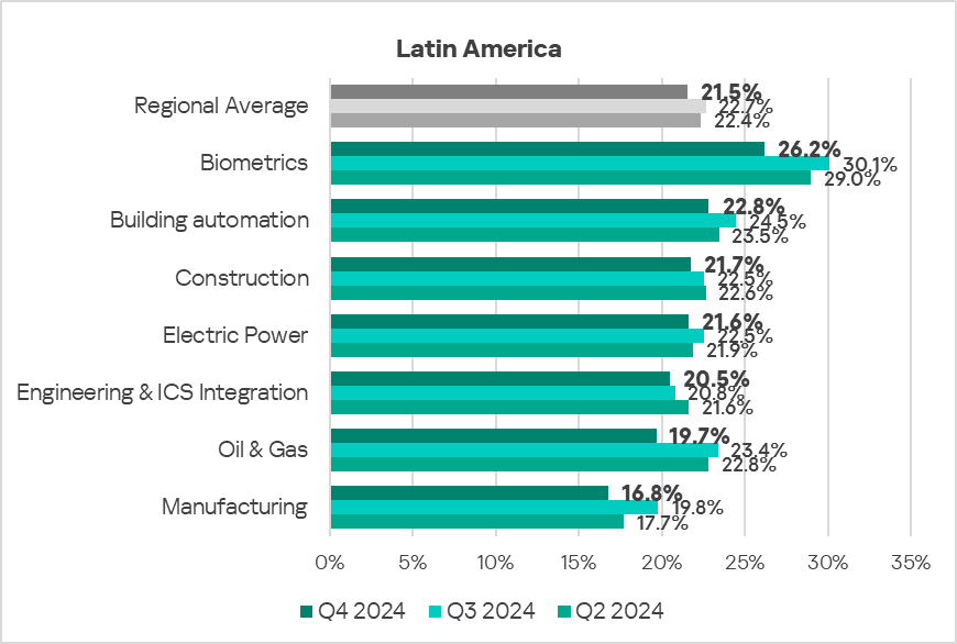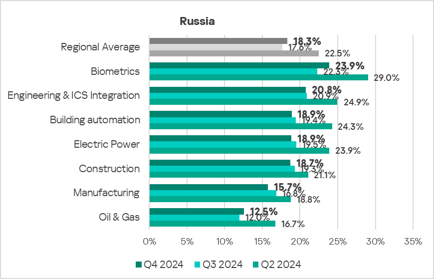 - In Q4 2024, the majority of the selected industries in the region exhibited a decrease in the percentage of ICS computers on which malicious objects were blocked. The oil and gas and biometrics sectors showed an increase. The latter grew by 1.1 times.