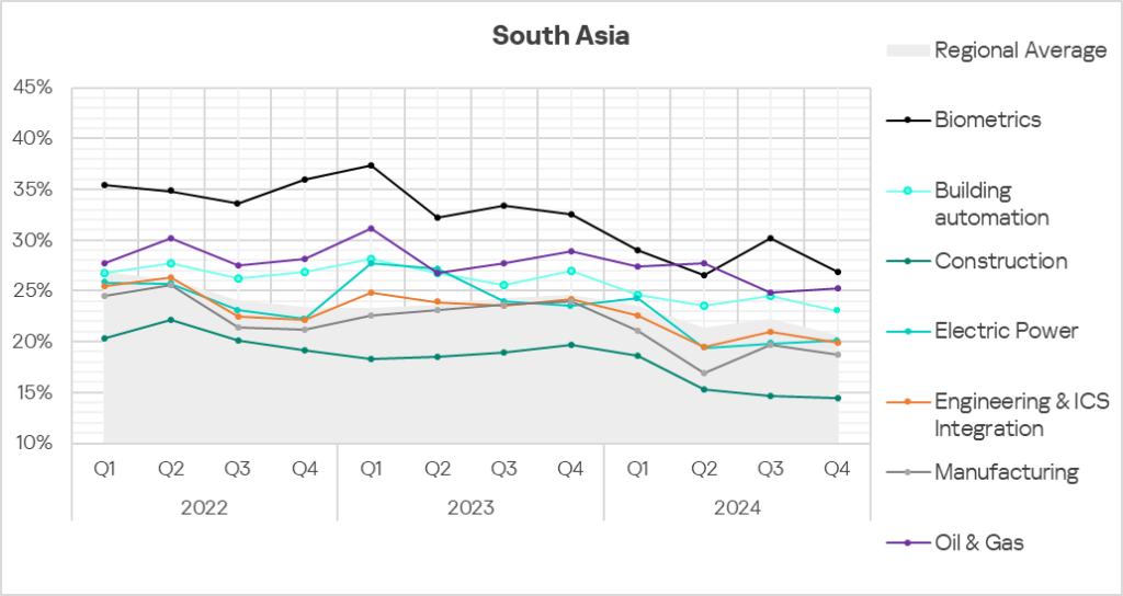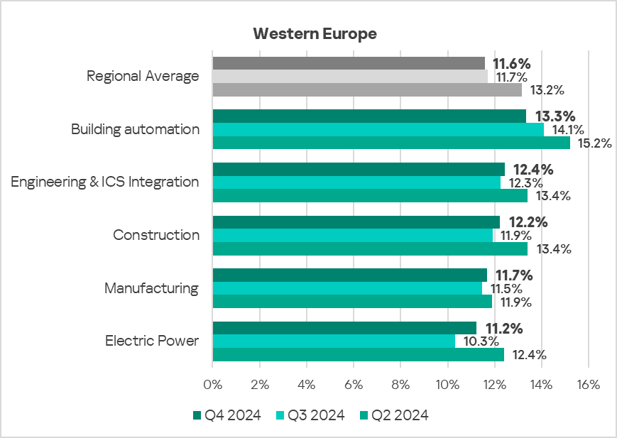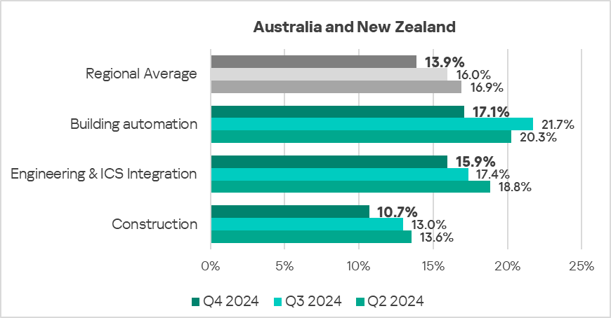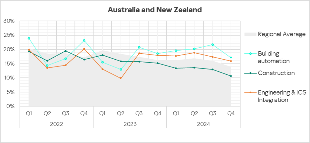 - In Q4 2024, the region showed a decrease in threats that were blocked on ICS computers.