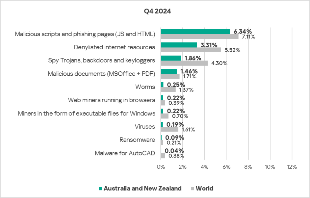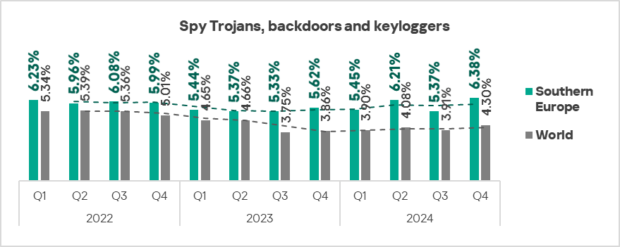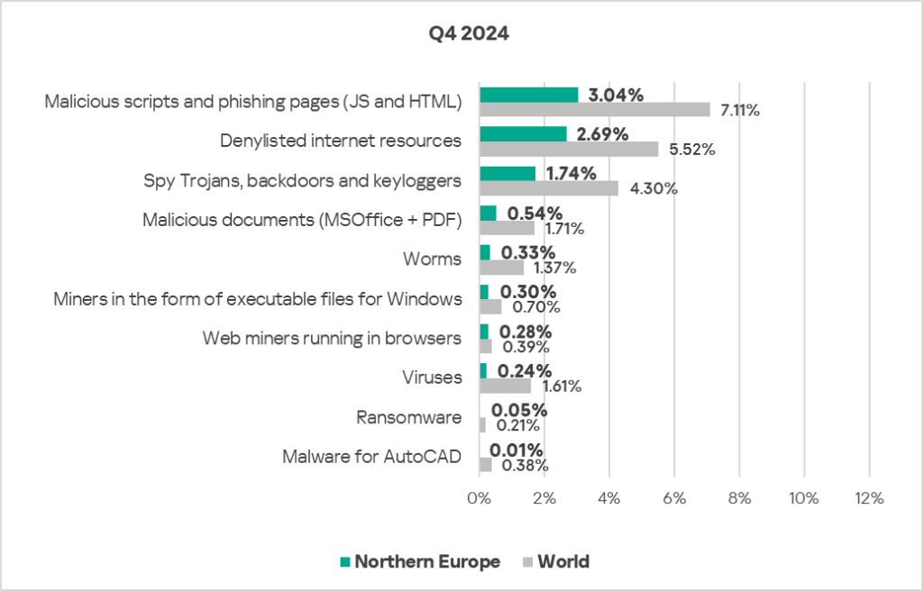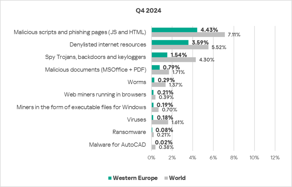 The surge in the percentage of ICS computers in Southern Europe on which malicious scripts, malicious documents, and spyware were blocked reflects the scale of this wave. - The largest proportional increase in Q4 2024 was in the percentage of ICS computers on which the following were blocked: