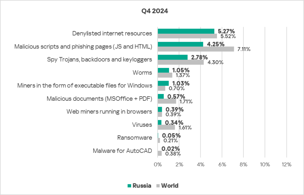 As previously noted in the Q3 2024 report, the increase in blocked denylisted internet resources was primarily driven by an increase in the number of newly created domain names and IP addresses used by cybercriminals as command and control (C2) infrastructure for distributing malware and phishing attacks.
