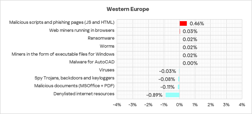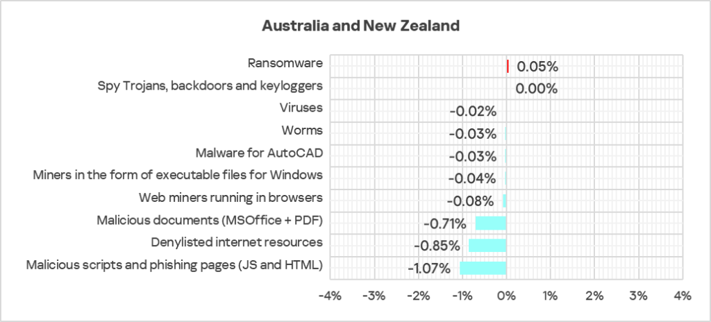 In the regional rankings of threat categories by percentage of ICS computers on which they were blocked, web miners ended up much higher regionally (eighth place globally) in Australia and New Zealand and Western Europe – sixth place in the respective regional rankings.