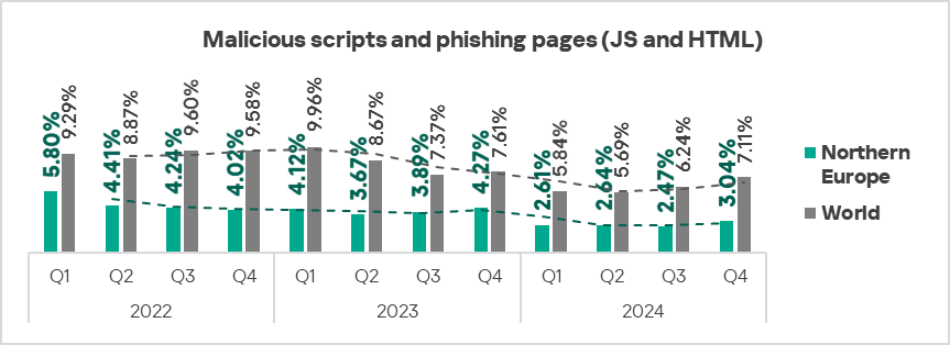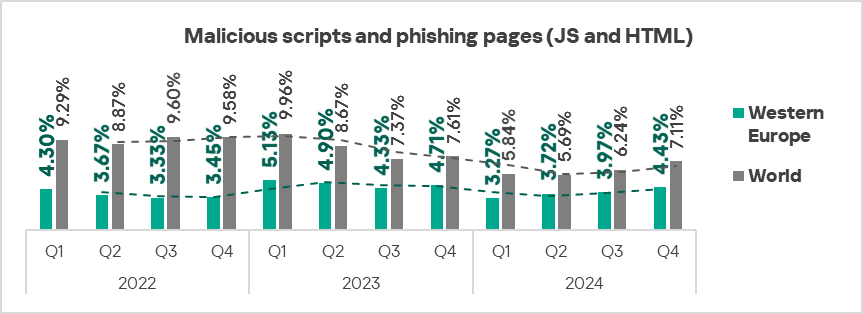 - Malicious scripts and phishing pages: 1.4 times higher (surpassing Q3 2024 levels), ranked second by value among the regions.