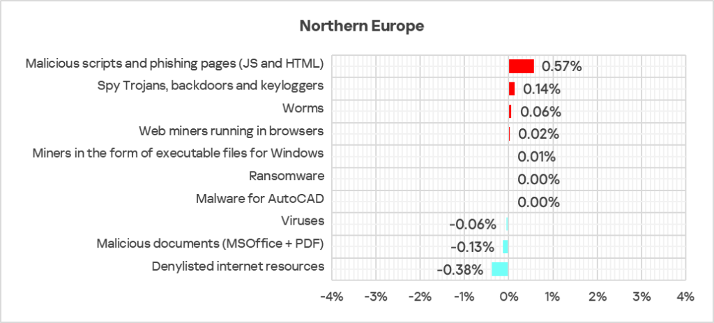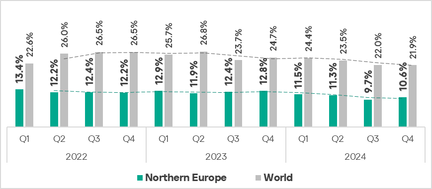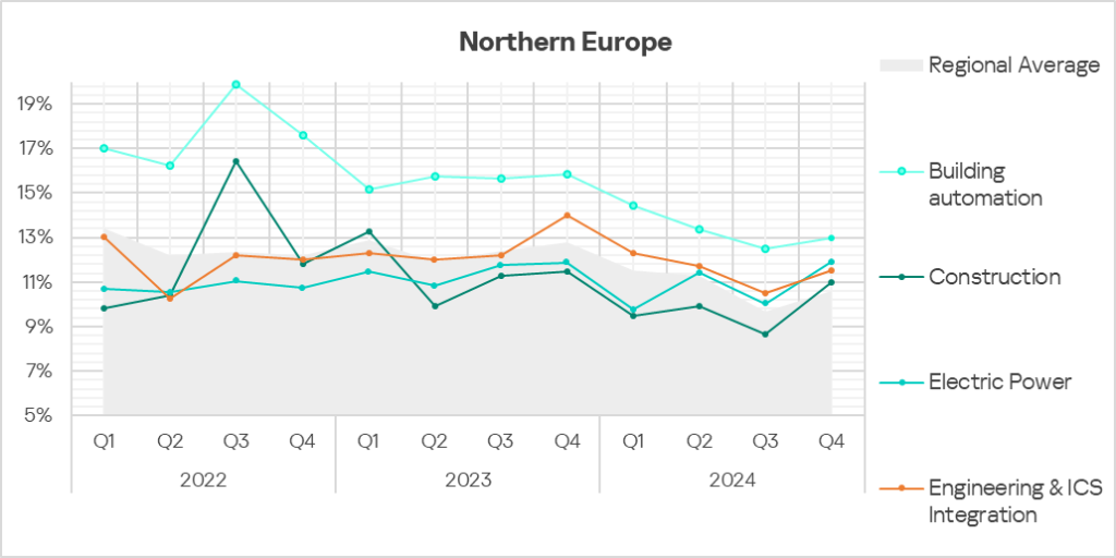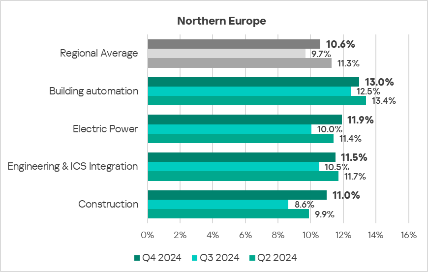 - In Q4 2024, Northern Europe saw an increase in the percentage of ICS computers on which malicious objects were blocked – by 1.1 times. The region was third globally in terms of growth.