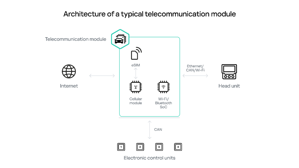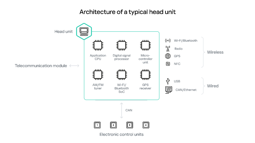Head unit and telecommunication module/unit components are the default entry points into a vehicle’s internal infrastructure and, as such, they are among the most frequent objects of security research. Simplified architectures of typical head units and telecommunication modules are shown in the diagrams below.