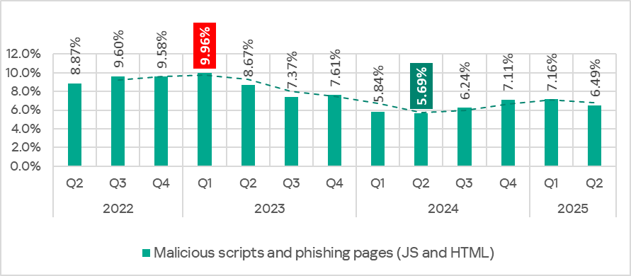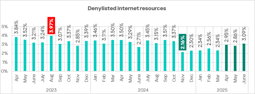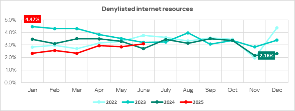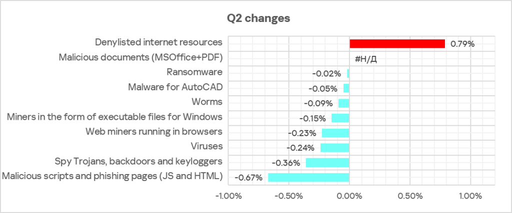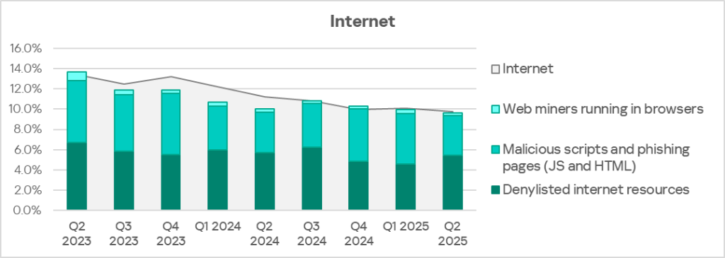 In Q2 2025, the only increases were in the percentages of ICS computers on which denylisted internet resources (1.2 times more than in the previous quarter) and malicious documents (1.1 times more) were blocked.
