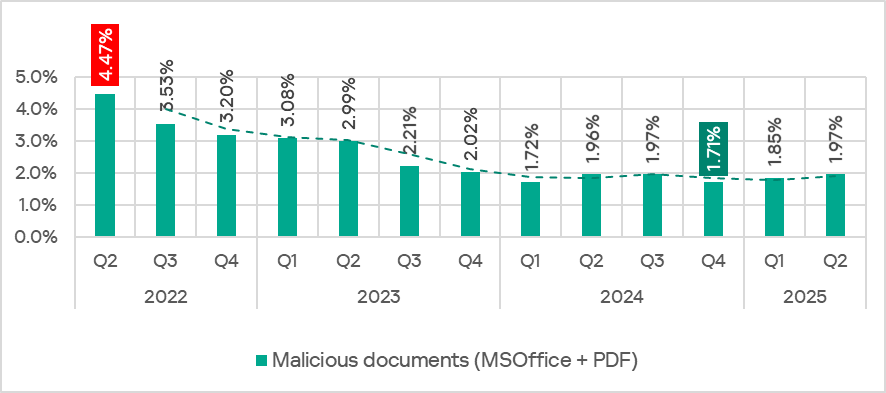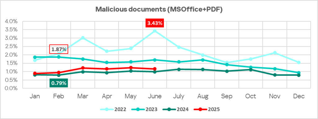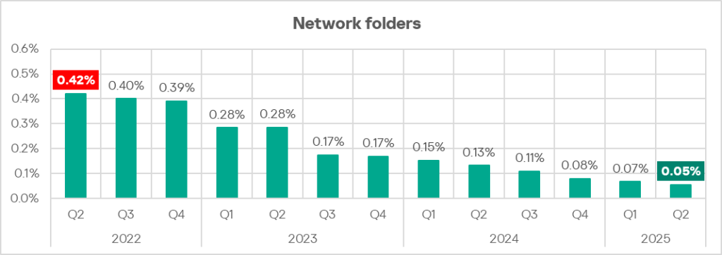 In Q2 2025, the percentage of ICS computers on which threats from network folders were blocked reached its lowest level since early 2022. This is typically a low-level threat source, but do not underestimate it – worms, viruses and malware for AutoCAD spread via network folders.