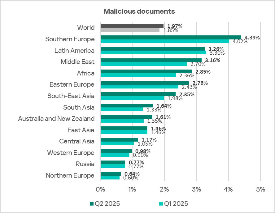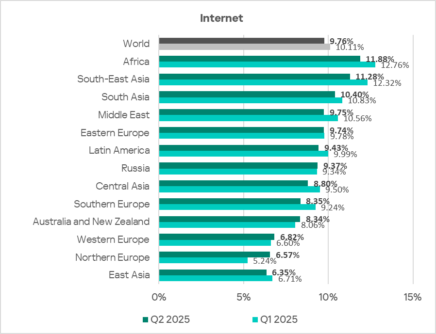 In Q2 2025, the percentage of ICS computers on which threats from email clients were blocked increased in all regions except Russia. The largest increase was seen in Latin America.