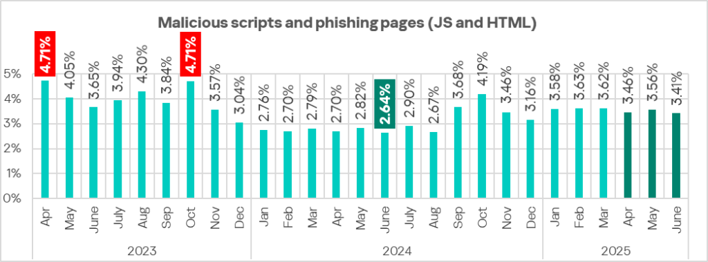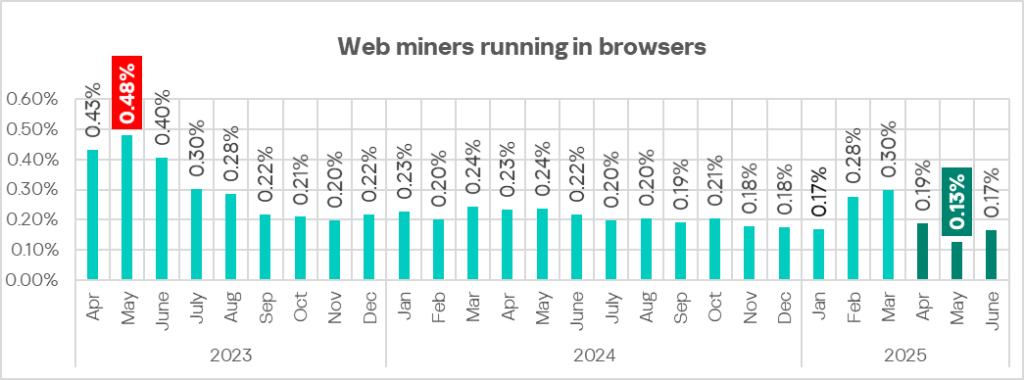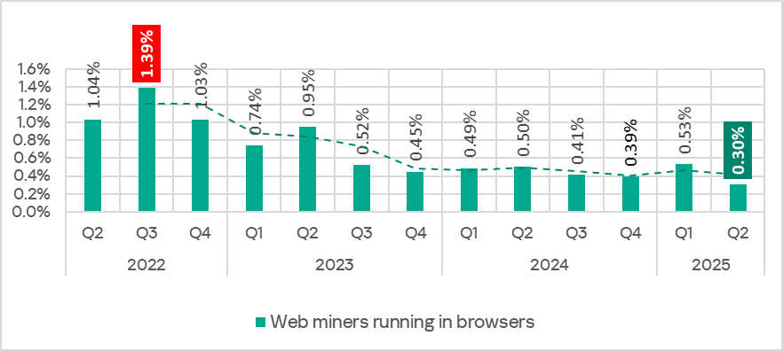 In Q2 2025, the percentage of ICS computers on which web miners were blocked decreased to 0.30%. It is the lowest value since Q2 2022.