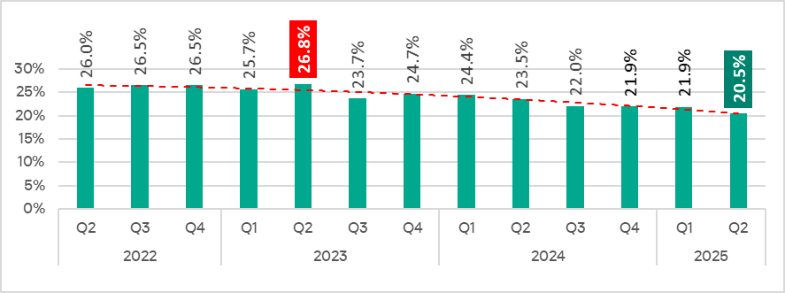 In Q2 2025 the percentage decreased in all regions except Northern Europe.