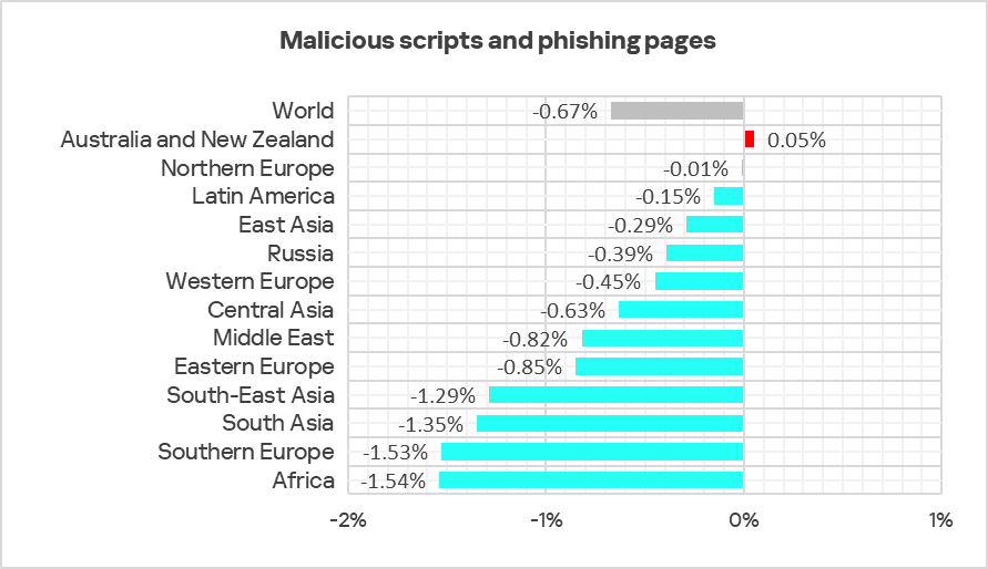 Malicious objects categorized as initial infection threats typically rank highest among threat categories in terms of the percentage of ICS computers on which threats were blocked. This is reflected in our statistics: globally and in almost all regions, malicious scripts and phishing pages, as well as denylisted internet resources are the top threat categories.