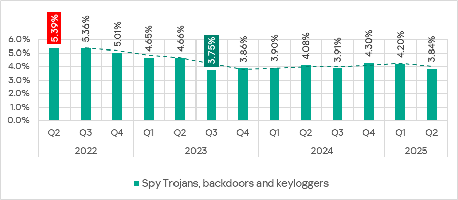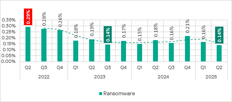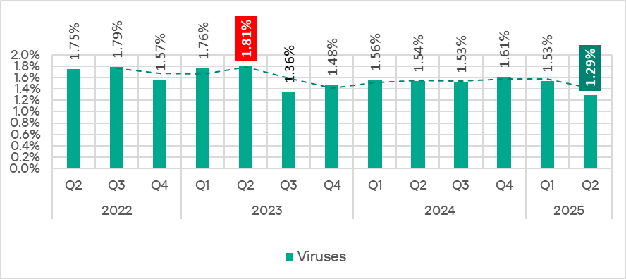 As was the case with worms, the percentage of ICS computers on which viruses were blocked decreased in Q2 2025 and reached its lowest level (1.29%) since Q2 2022.
