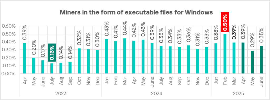 In Q2 2025, the percentage of ICS computers on which miners in the form of executable files for Windows were blocked decreased to 0.63%.