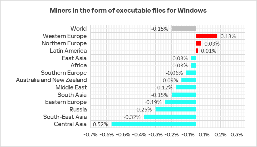 Regionally, the percentage of ICS computers on which miners in the form of executable files for Windows were blocked ranged from 0.19% in East Asia to 1.20% in Central Asia. The top three regions for this indicator were Central Asia, Russia, and Africa.
