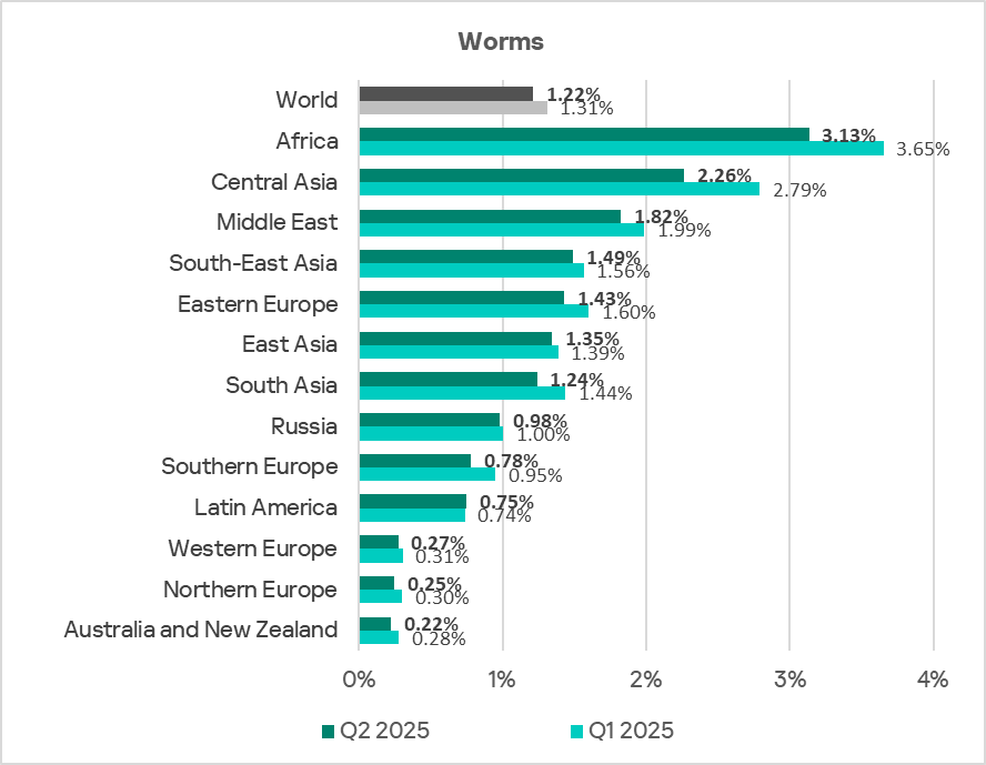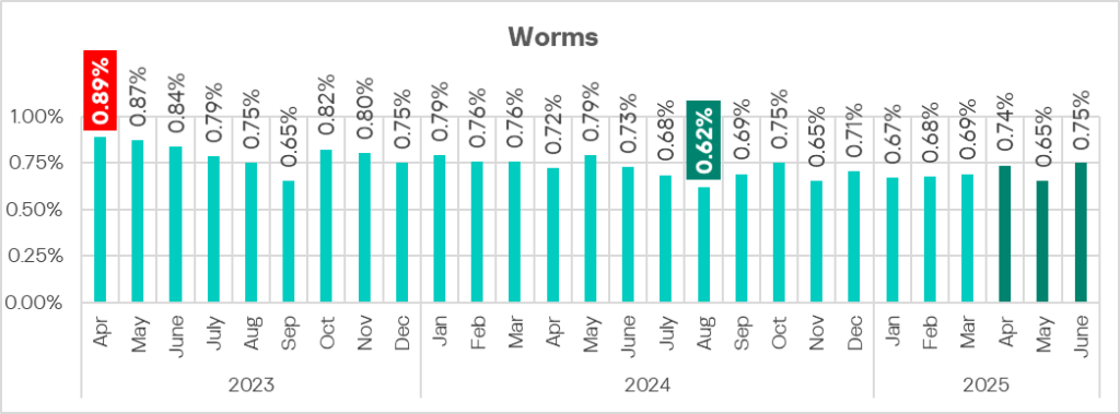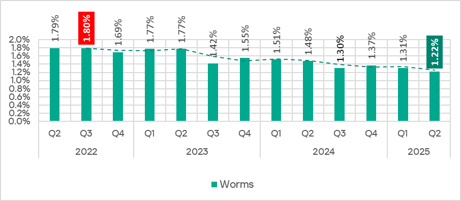 In Q2 2025, the percentage of ICS computers on which worms were blocked decreased to 1.22%. That is the lowest value since Q2 2022.