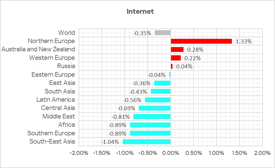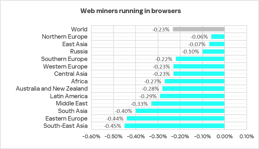 Regionally, the percentage of ICS computers on which web miners were blocked ranged from 0.11% in East Asia to 0.54% in Africa. The top three regions for this indicator were Africa, Latin America, and South-East Asia.