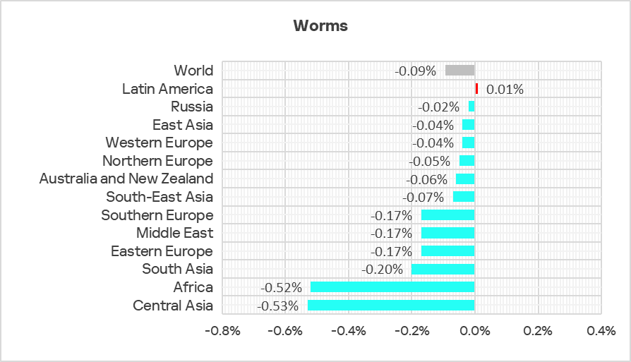 Regionally, the percentage of ICS computers on which worms were blocked ranged from 0.22% in Australia and New Zealand to 3.13% in Africa. The top three regions for this indicator were Africa, Central Asia, and the Middle East.