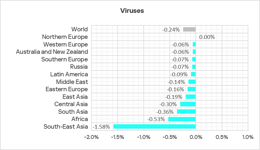 Regionally, the percentage of ICS computers on which viruses were blocked ranged from 0.13% in Australia and New Zealand to 7.10% in South-East Asia. The top three regions for this indicator were South-East Asia, Africa, and East Asia.