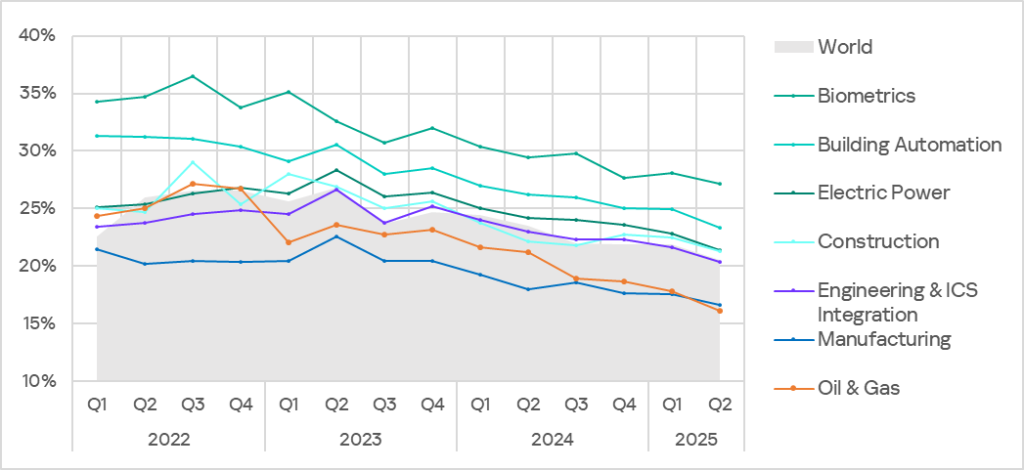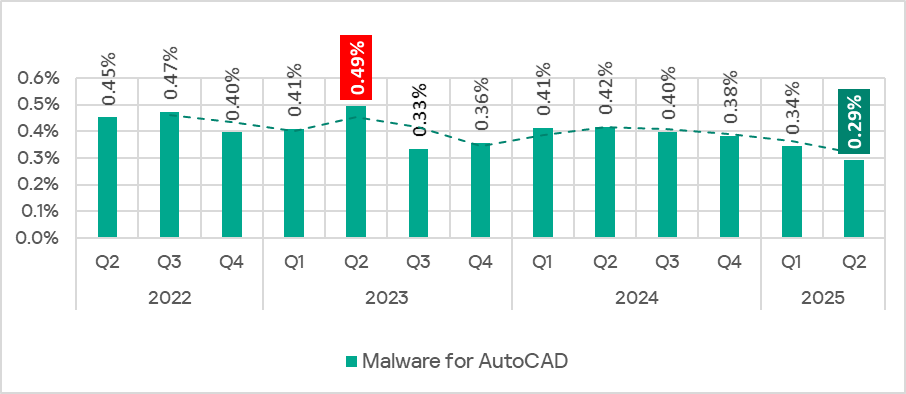 In Q2 2025, the percentage of ICS computers on which AutoCAD malware was blocked continued to decrease and reached its lowest level since Q2 2022.