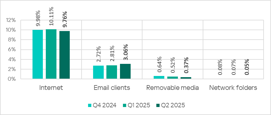 The internet (visiting malicious or compromised internet resources; malicious content distributed via messengers; cloud data storage and processing services and CDNs), email clients (phishing emails), and removable storage devices remain the primary sources of threats to computers in an organization’s technology infrastructure.