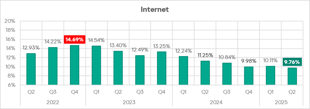 In Q2 2025, the percentage of ICS computers on which threats from the internet were blocked decreased to 9.76% and reached its lowest level since Q2 2022.