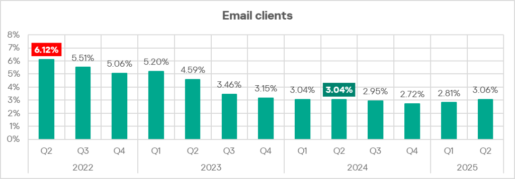 In Q2 2025, the percentage of ICS computers on which threats from email clients were blocked continued to increase.