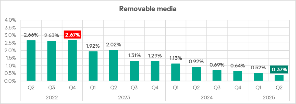 In Q2 2025, the percentage of ICS computers on which threats from removable media were blocked continued to decrease and reached its lowest level since the beginning of 2022.