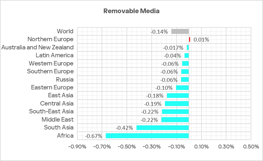 Regionally, the percentage of ICS computers on which threats from removable media were blocked ranged from 0.04% in Australia and New Zealand to 1.77% in Africa. The top three regions for this indicator were Africa, East Asia and the Middle East.