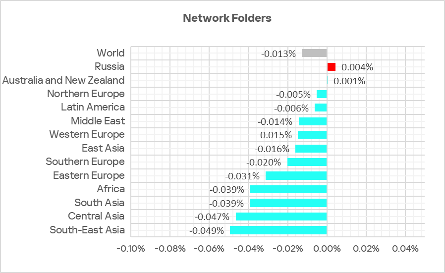 Regionally, the percentage of ICS computers on which threats from network folders were blocked ranged from 0.01% in Northern Europe to 0.25% in East Asia. The top three regions for this indicator were East Asia, South-East Asia, and South Asia.