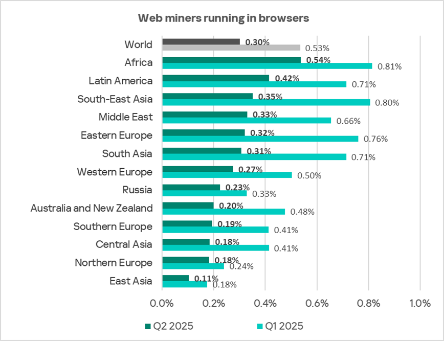 In Q2 2025, the percentage of ICS computers on which web miners were blocked decreased in all regions.