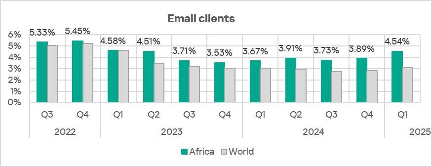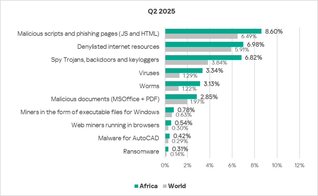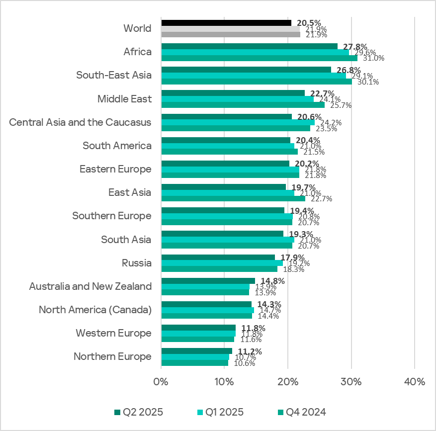 Another of the region’s persistent problems is spyware. Africa consistently leads regions in the percentage of ICS computers on which spyware was blocked. In Q2 2025, the figure in Africa decreased to 6.82%, but this is still 4.9 times higher than in Western Europe, which has the lowest rate.