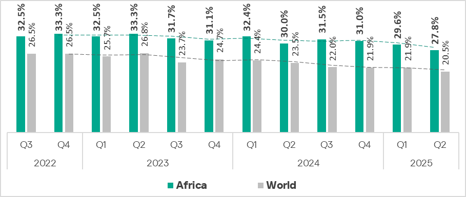In Q2 2025, the percentage of ICS computers in Africa on which malicious objects were blocked dropped to 27.8%. This indicator has been declining in the region for three consecutive quarters.