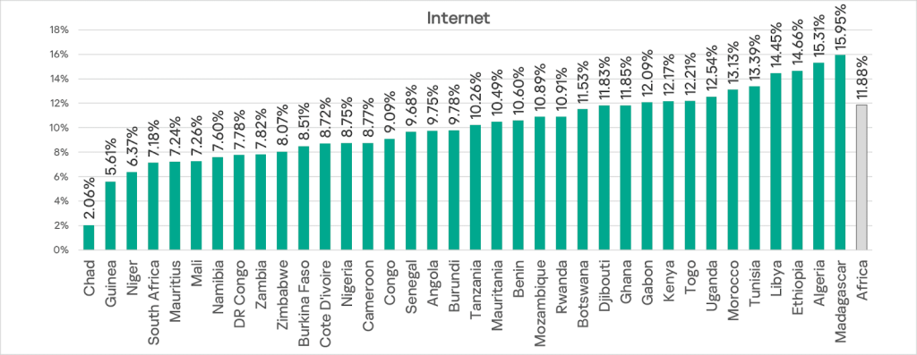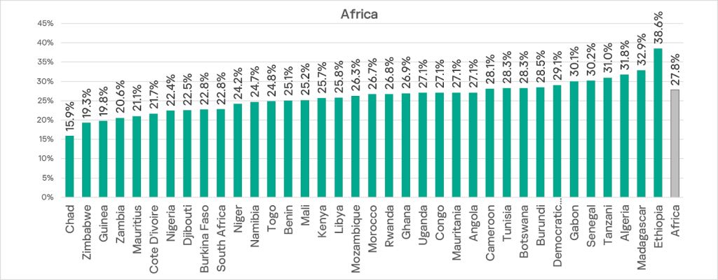 Across African countries, the percentage ranges from 15.9% in Chad to 38.6% in Ethiopia.