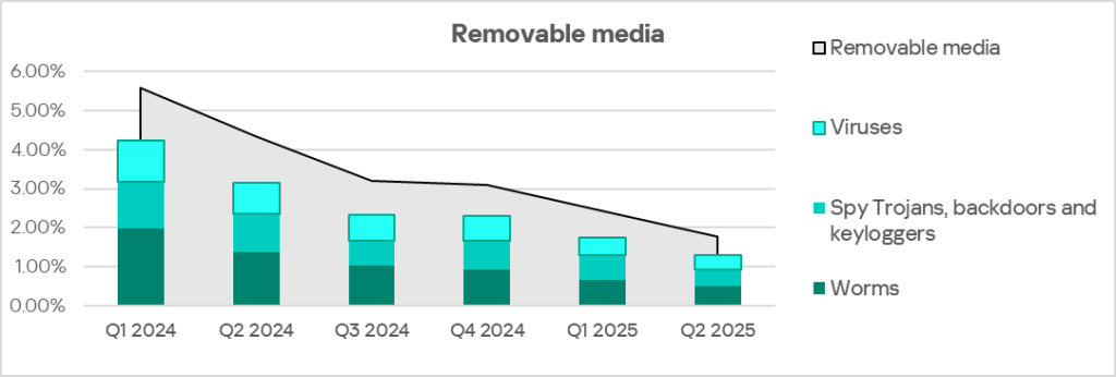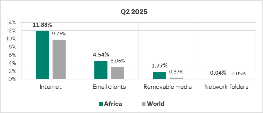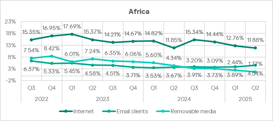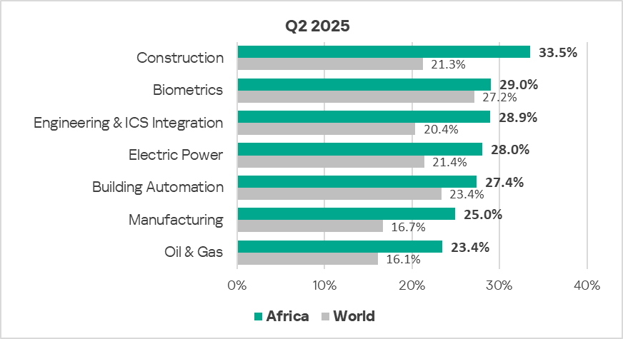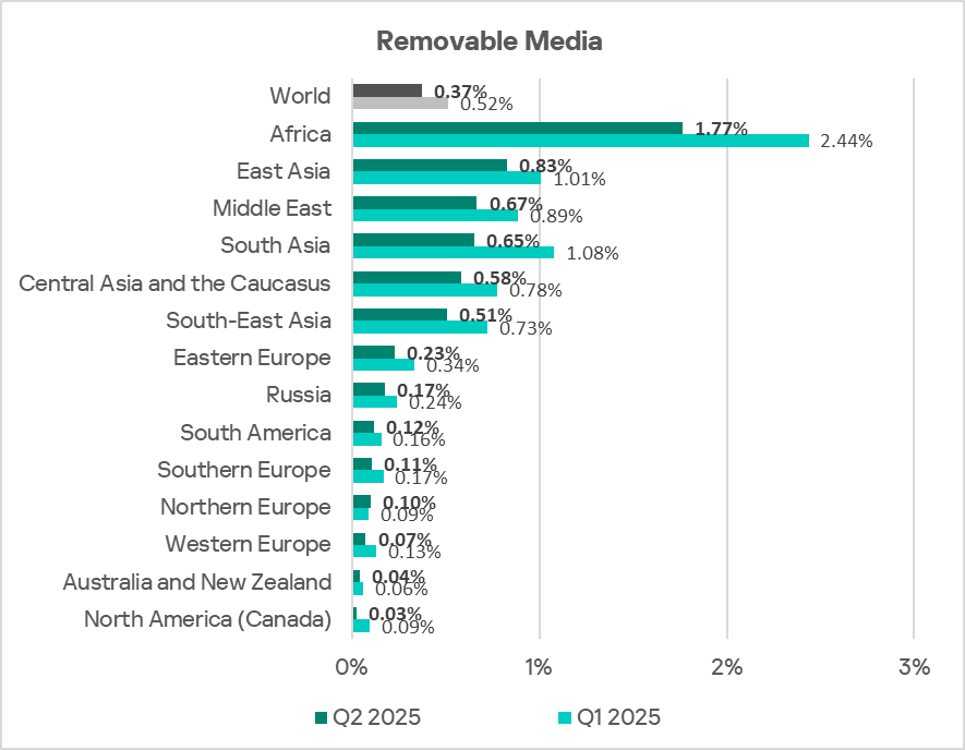 In Q2 2025, the percentage of ICS computers on which threats from removable media were blocked was 4.8 times higher than the global average. In this indicator, Africa leads the world by a wide margin.