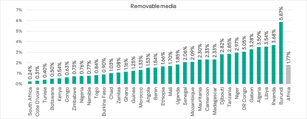 Among the countries in the region, Burundi leads by a wide margin in the percentage of ICS computers on which threats from removable media were blocked, with 5.8%. The figures for other countries range from 0.24% in South Africa to 3.68% in Rwanda.