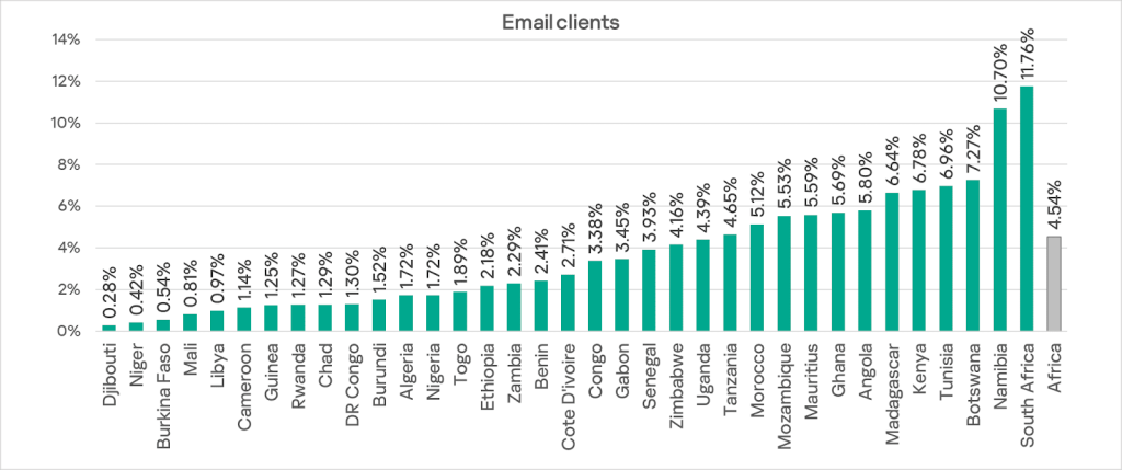 Email clients are the only threat source in the region that has shown a rising trend for over a year. By percentage of ICS computers on which threats from email clients were blocked, Africa ranks fourth among the world’s regions at 4.54%. This is 5.7 times higher than in Russia, which has the lowest figure among regions.