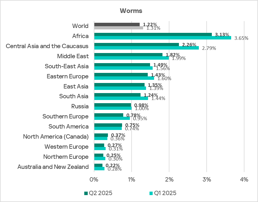 Africa has been a long-time leader among regions in the percentage of ICS computers on which worms were blocked. In Q2 2025, Africa’s figure (3.13%) is 14.2 times higher than that of Australia and New Zealand, which ranks last in this category.