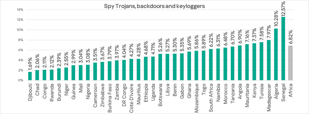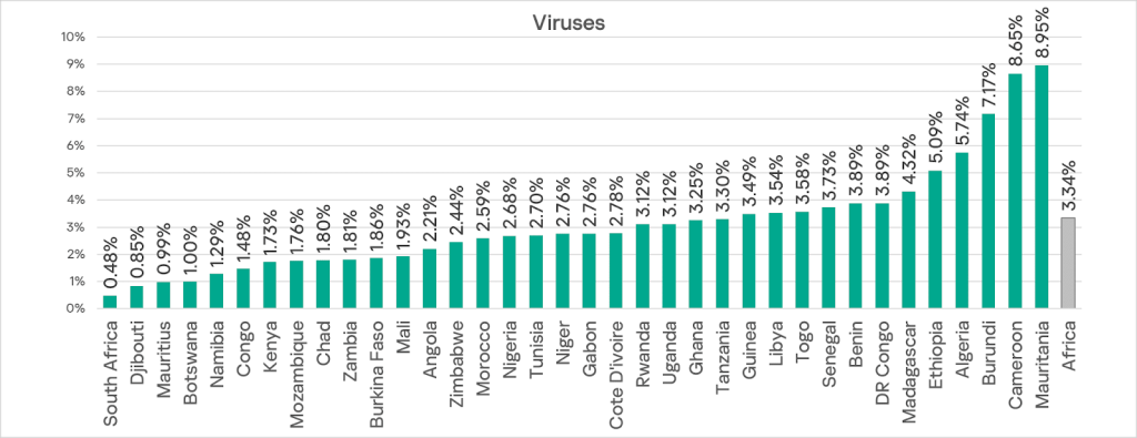 Among the region’s countries, Mauritania, Cameroon, and Burundi lead in the percentage of ICS computers on which viruses were blocked, at 6.23%. As with worms, there is a wide range between countries: the highest figure (Mauritania at 8.95%) is 18.6 times higher than the lowest (South Africa, 0.48%).