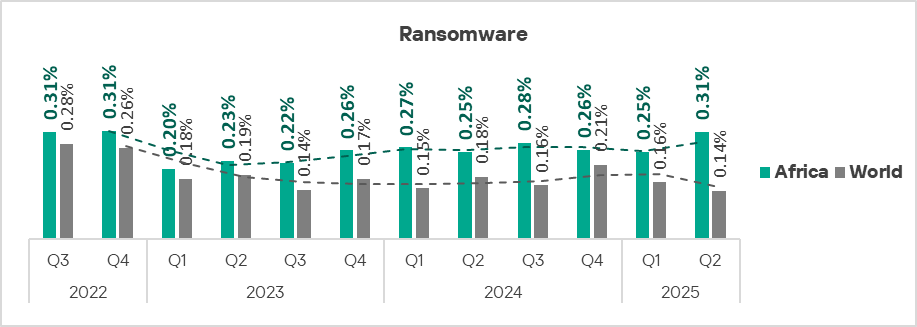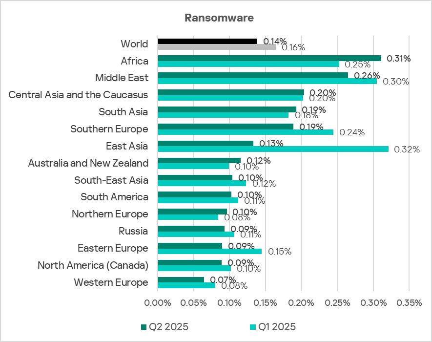 Africa ranks first among all regions in the increase of the percentage of ICS computers on which ransomware was blocked: 0.31% in Q2 2025. This is 4.8 times higher than the region with the lowest rate, Western Europe.