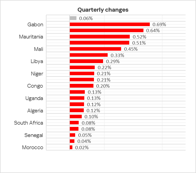 The percentage of ICS computers attacked by ransomware has risen most in Gabon and Rwanda, but in some countries of the region it didn’t increase at all. The chart below shows only countries with observed increases.