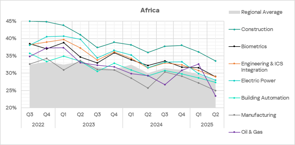 For many years, Africa has led the world by the percentage of ICS computers on which malicious objects were blocked. Compared to the global average, Africa’s figure in Q2 2025 was 1.4 times higher. Compared to Northern Europe, which ranks lowest, the figure was 2.5 times higher.