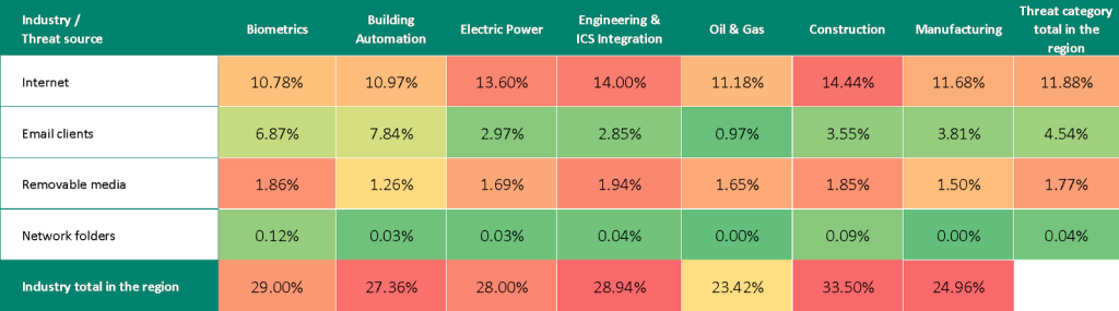 - Third among the region’s industries in terms of email client threats. Fourth in terms of internet threats.